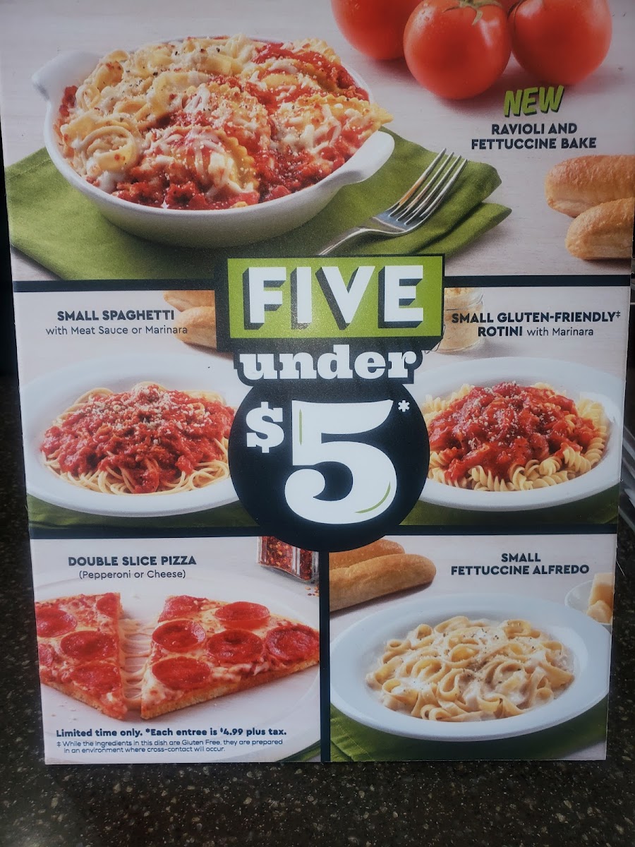 Choose from Spaghetti with Marinara or Meat Sauce, Fettuccine with Alfredo Sauce, Penne with Marinara or Meat Sauce, Lasagna with Meat Sauce, Cheese or Pepperoni Pizza Slice or House Side Salad. Pasta dishes are half portions and includes a Small ...